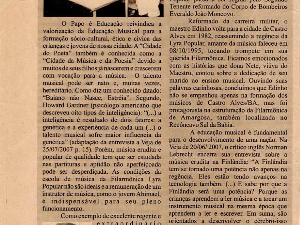 Em registro de 1964, o jornal “O Papo é Educação” celebra a volta do sargento Edson Vilas Boas como Maestro da Lyra Popular.