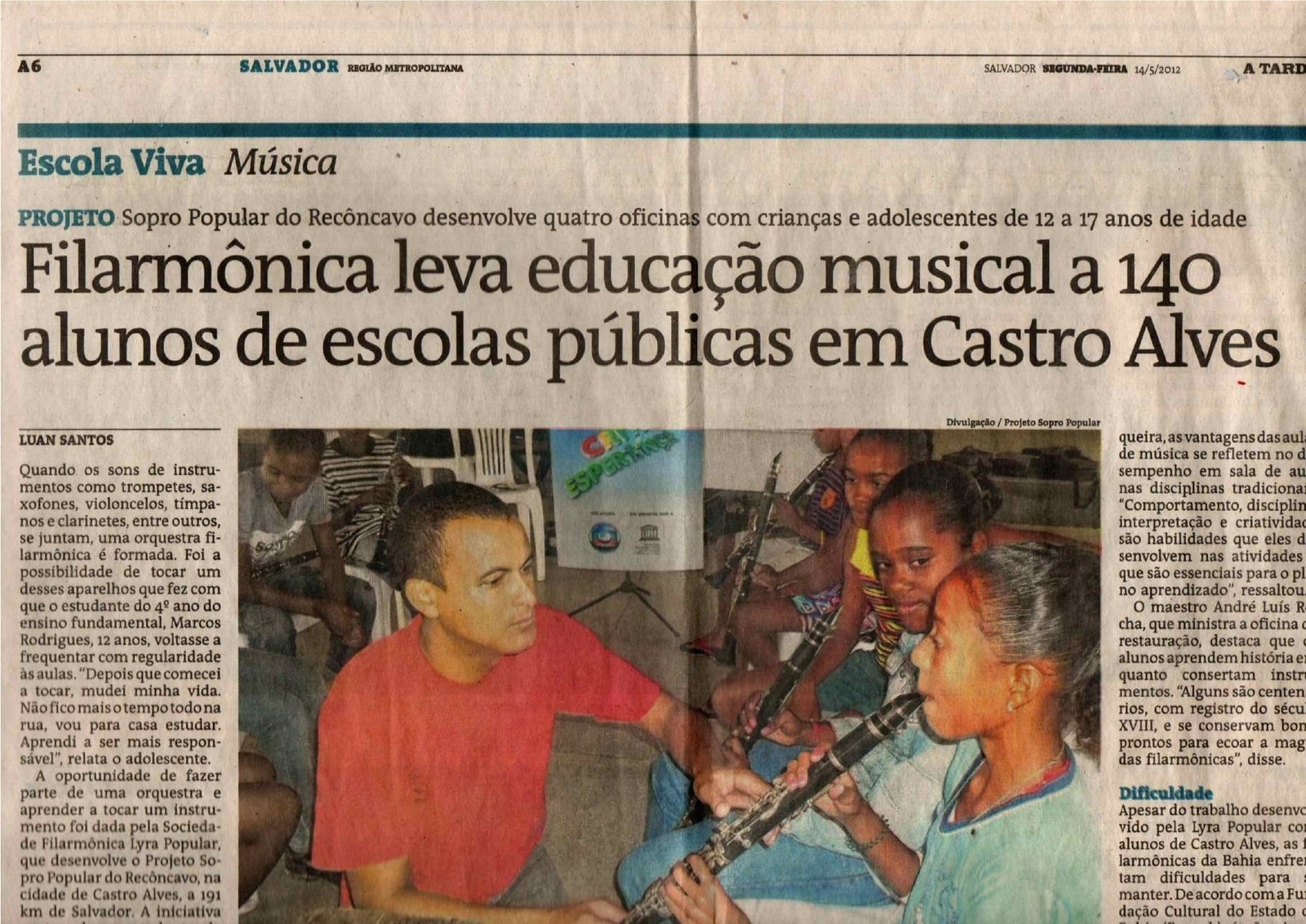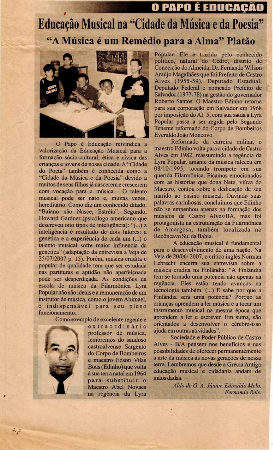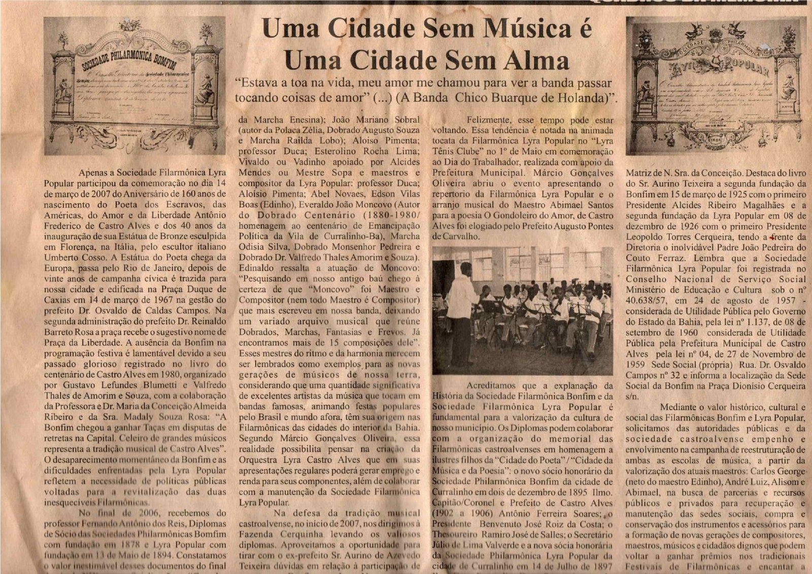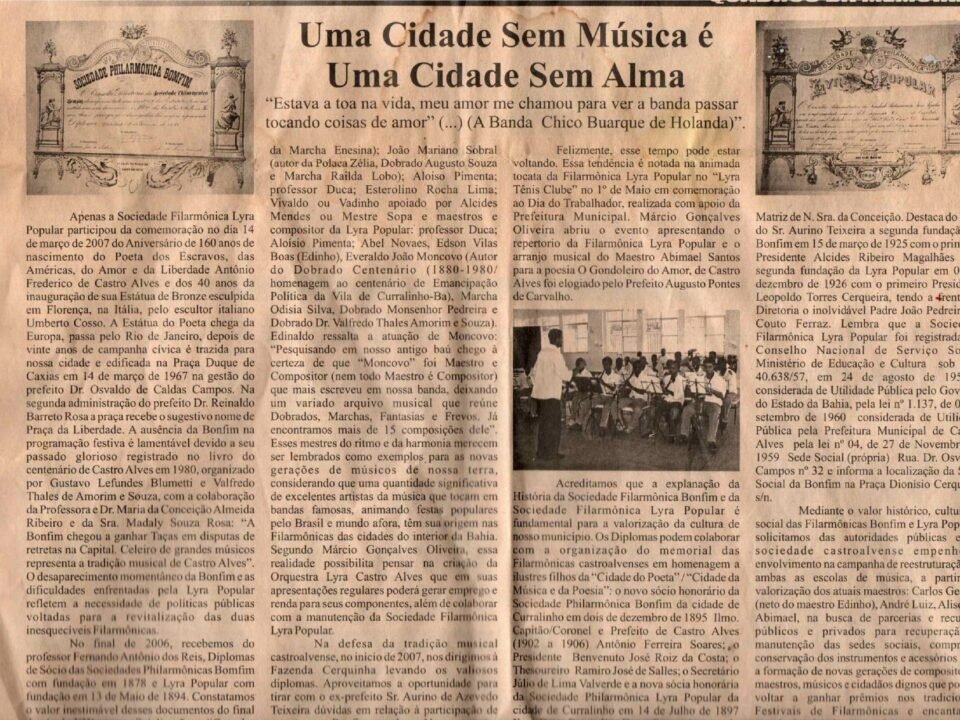 Em 2007 periódico destacou que apenas a Filarmônica Lyra Popular participou dos festejos do 160º aniversário de nascimendo de Castro Alves.