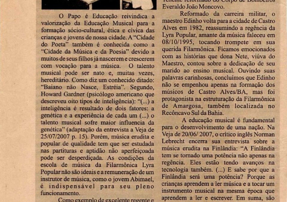Em registro de 1964, o jornal “O Papo é Educação” celebra a volta do sargento Edson Vilas Boas como Maestro da Lyra Popular. Compartilhar Posts relacionadosoutubro 23, 2025TESTE MIDIAleia maisoutubro 14, 2025A Tarde – 2012leia mais